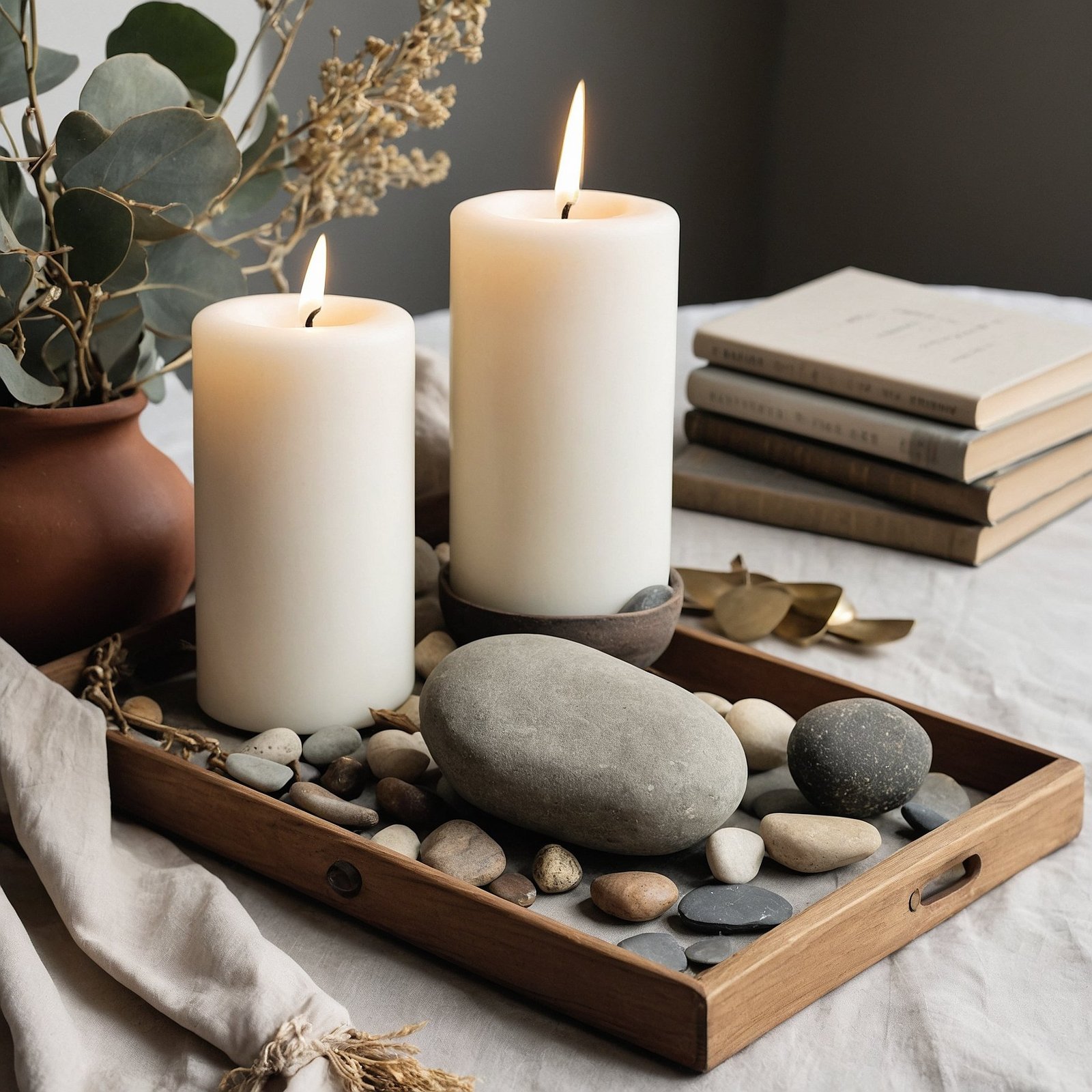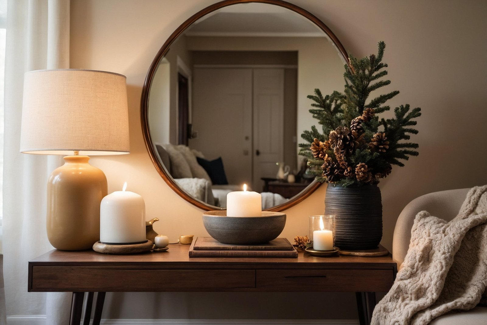 Your console table is not an island. Pull at least one color from the surrounding room and echo it in one of your vignette objects. If your sofa has mustard cushions, add a mustard-toned candle or a book with a yellow spine. This repetition is what makes a room feel designed rather than decorated.